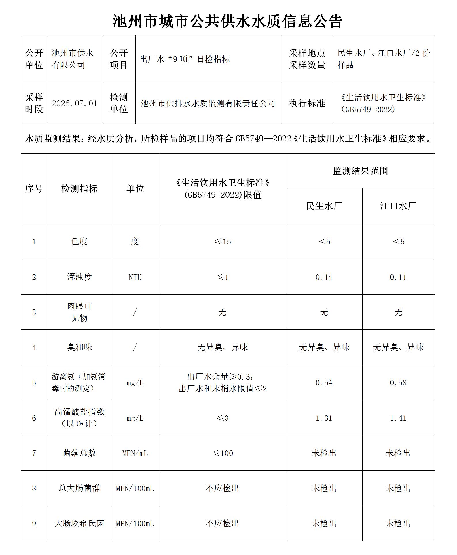 池州市城市公共供水水質(zhì)信息公告出廠水“9項(xiàng)”日檢指標(biāo)2025.07.01 | |