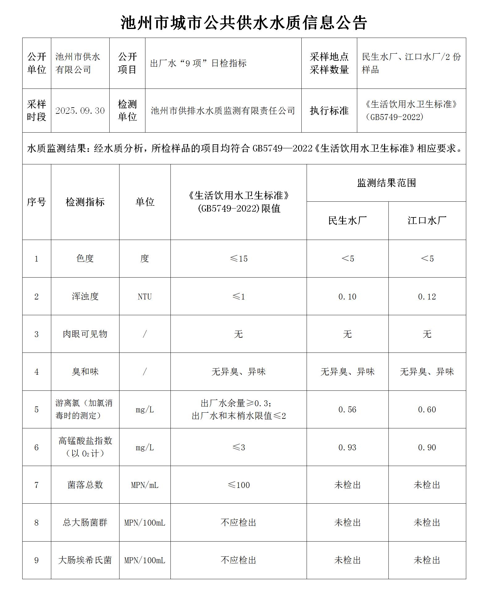 池州市城市公共供水水質(zhì)信息公告出廠水“9項(xiàng)”日檢指標(biāo)20250930 | |