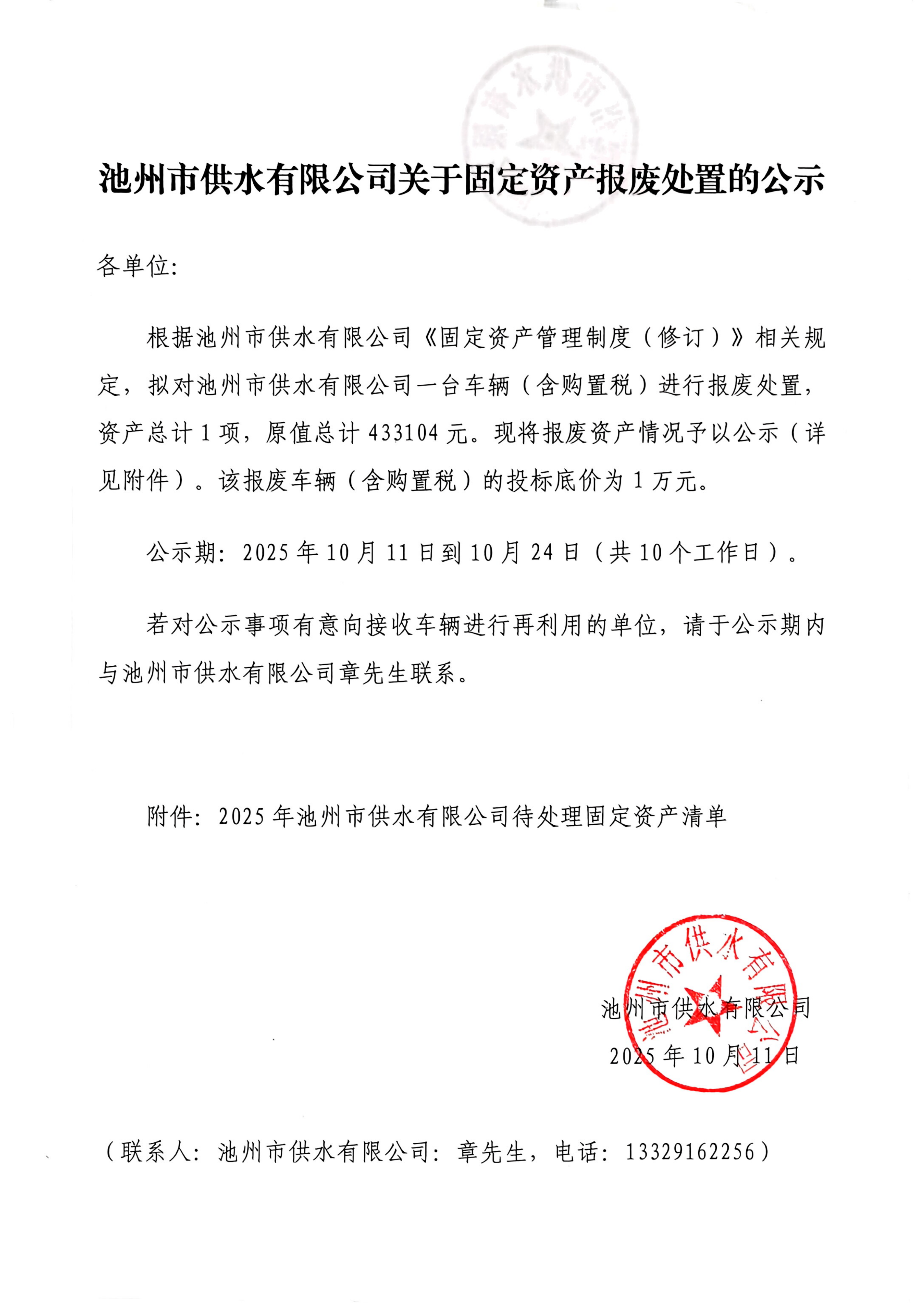 池州市供水有限公司關(guān)于固定資產(chǎn)報(bào)廢處置的公示 | |